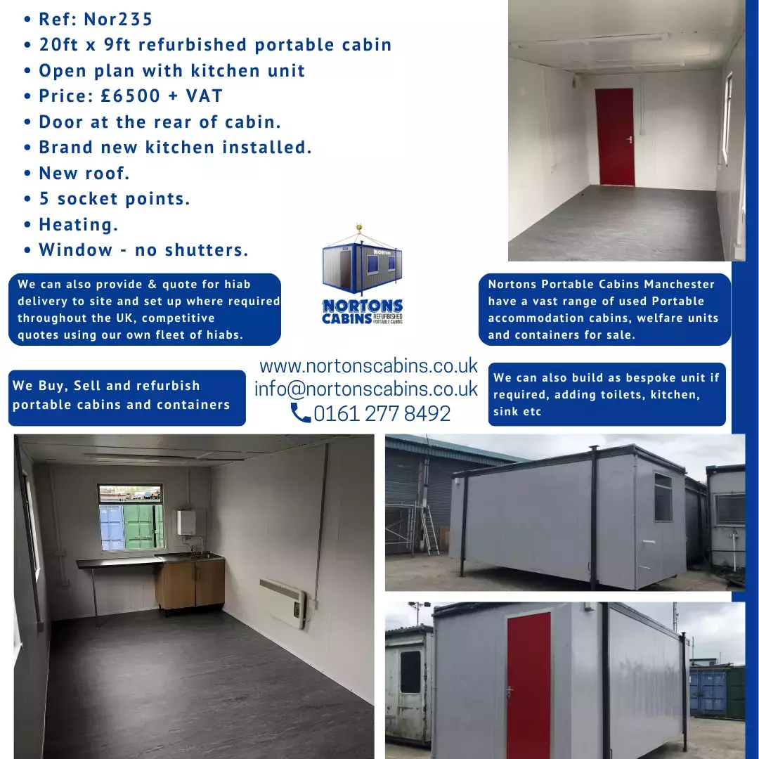 We have a wide selection of used cabins, containers, buildings available that can be utilized as office space, meeting rooms, call centres, sales and marketing suites, nurseries, kitchens, classrooms, toilet and shower blocks, canteens, construction and security offices, storage units, antivandal, welfare units, secure storage containers, onsite and much more. By choosing a refurbished used unit you will have a building that is durable enough to last long-term at a cost-effective price. Our used containers and buildings will be delivered from our central North West Manchester depot.